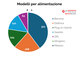 Nella tabella è riportato il numero di modelli per ciascuna alimentazione (il totale è superiore a 517 perché molti modelli hanno più alimentazioni), mentre nel grafico è illustrato il peso di ciascuna alimentazione rispetto all’offerta complessiva.