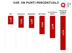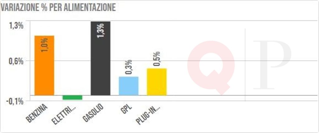 Nel solo mese di ottobre, l’incremento medio dei prezzi su base annua disaggregato per alimentazioni ha registrato I seguenti dati (benzina e gasolio comprendono le rispettive mild hybrid):