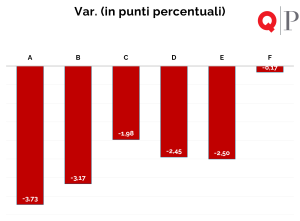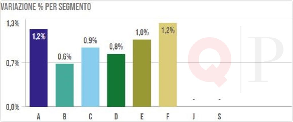 Andando nel dettaglio dei singoli segmenti, un calo medio particolarmente significativo ha riguardato le citycar (-5,3%), ambito che però ha registrato una non trascurabile contrazione dell’offerta (-10% di modelli e -26% di versioni). Giù anche il prezzo medio di listino dei segmenti D (-1,5%) ed E (-0,9%), mentre hanno registrato un leggero rialzo i segmenti B (+0,1%) e C (+0,5%) e, in misura maggiore, l’F (+1,7%), segmento che, come accennato, per l’entità del prezzo medio che lo caratterizza e per la varietà di versioni trascina i valori e le variazioni di tutto il mercato.