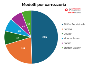 Infine, la tipologia di veicolo. Metà dei modelli a listino a dicembre 2025 rientra nella categoria Suv, che comprende anche crossover e fuoristrada, mentre solo uno su cinque è nelle berline. Ai minimi termini le Station Wagon, meno del 6%. Nella tabella sottostante, il totale è superiore ai 517 modelli a listino a dicembre 2025 in quanto alcuni modelli sono declinati in più tipologie di carrozzeria.