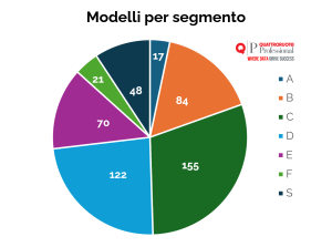 Se invece si scompone l’offerta nei segmenti in cui si articola il mercato, si osserva che la maggior parte dei modelli a listino a dicembre 2025 fa parte dei segmenti C (30%) e D (23,6%) e che sette su dieci fanno parte dei segmenti B, C e D. La tabella e il grafico illustrano la composizione dell’offerta da questo punto di vista.