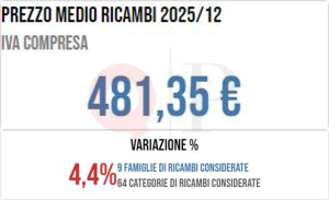 Se si scorpora il dato medio nei due gruppi principali, si osserva che a gennaio 2026 il prezzo medio di listino Iva inclusa dei ricambi ufficiali (OEM) di carrozzeria, pari a 485,40 euro, è aumentato del 3,4% tendenziale, ossia a un ritmo pari a tre volte l’inflazione, mentre l’analogo dato riferito ai componenti di meccanica (526,62 euro) è salito solo, si fa per dire, del 2,0% sempre nel confronto con gennaio 2025.