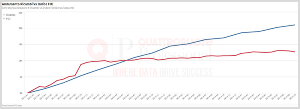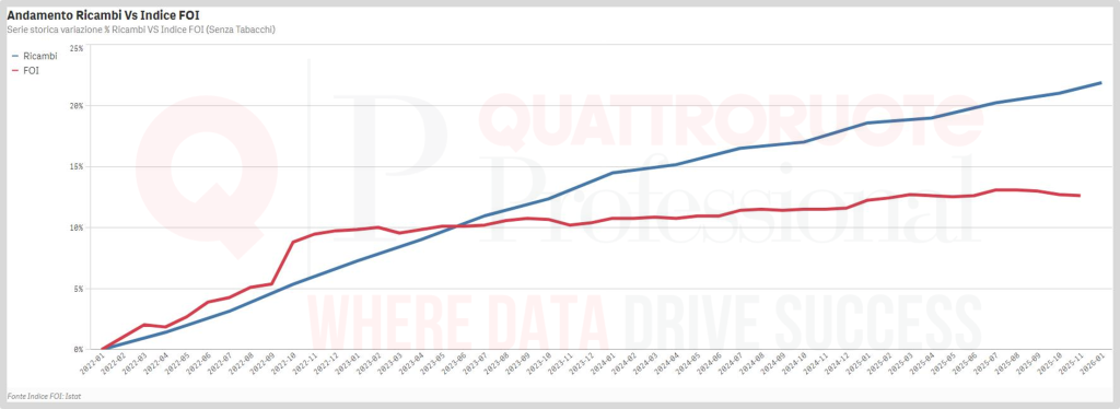 Tuttavia, nonostante il rallentamento, la media dei prezzi dei ricambi continua a correre, in media, a ritmi più che doppi rispetto all’inflazione. L’Istat non ha ancora diffuso i dati di gennaio, ma a dicembre 2025 l’indice dei prezzi al consumo per l’intera collettività (Nic) ha registrato una variazione tendenziale di appena l’1,2%, mentre l’indice Foi, quello relativo alle famiglie di operai e impiegati, ha evidenziato un rialzo, sempre su base annua, dell’1,1%. Si capirà di più con i dati di gennaio, che l’Istituto di statistica diffonderà a febbraio, ma la forbice tra l’inflazione dei ricambi auto e quella dei prezzi al consumo appare destinata ad allargarsi ulteriormente (nel grafico sotto, le due dinamiche con base 100 a gennaio 2022: in rosso l’indice Foi, in blu la media dei prezzi di listino Iva inclusa dei ricambi OEM).