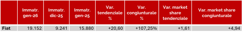 Tra le prime 20 marche per numero di auto immatricolate sul mercato italiano a gennaio, Fiat è stata quella che ha registrato le migliori performance. Rispetto a dicembre 2025 le immatricolazioni (+107,3%) sono più che raddoppiate (solo Peugeot ha fatto meglio, +122,4%). In termini tendenziali, ossia nel confronto con lo stesso mese del 2025, il brand “torinese” (+20,6%) è terzo per crescita alle spalle di BYD (+329%), che però un anno fa con poco più di 800 esemplari era ventisettesima nella classifica mensile delle marche, e Mercedes (+30,4%).